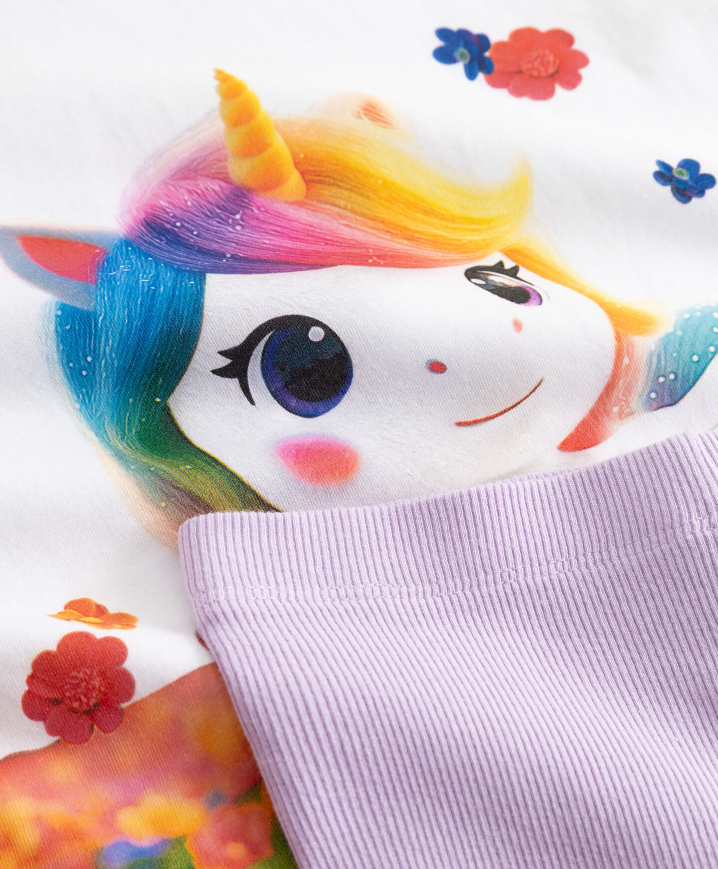 Setul pentru fete cu model de unicorn este format dintr-un tricou și colanți scurți. Tricoul este realizat din bumbac moale, plăcut la atingere, iar imprimeul din față va cuceri orice mică iubitoare a acestor creaturi fantastice. Colanții, cu conținut ridicat de bumbac, sunt elastici și se așază frumos pe corp, fără să limiteze mișcarea în timpul jocului. Sunt disponibile diverse modele.