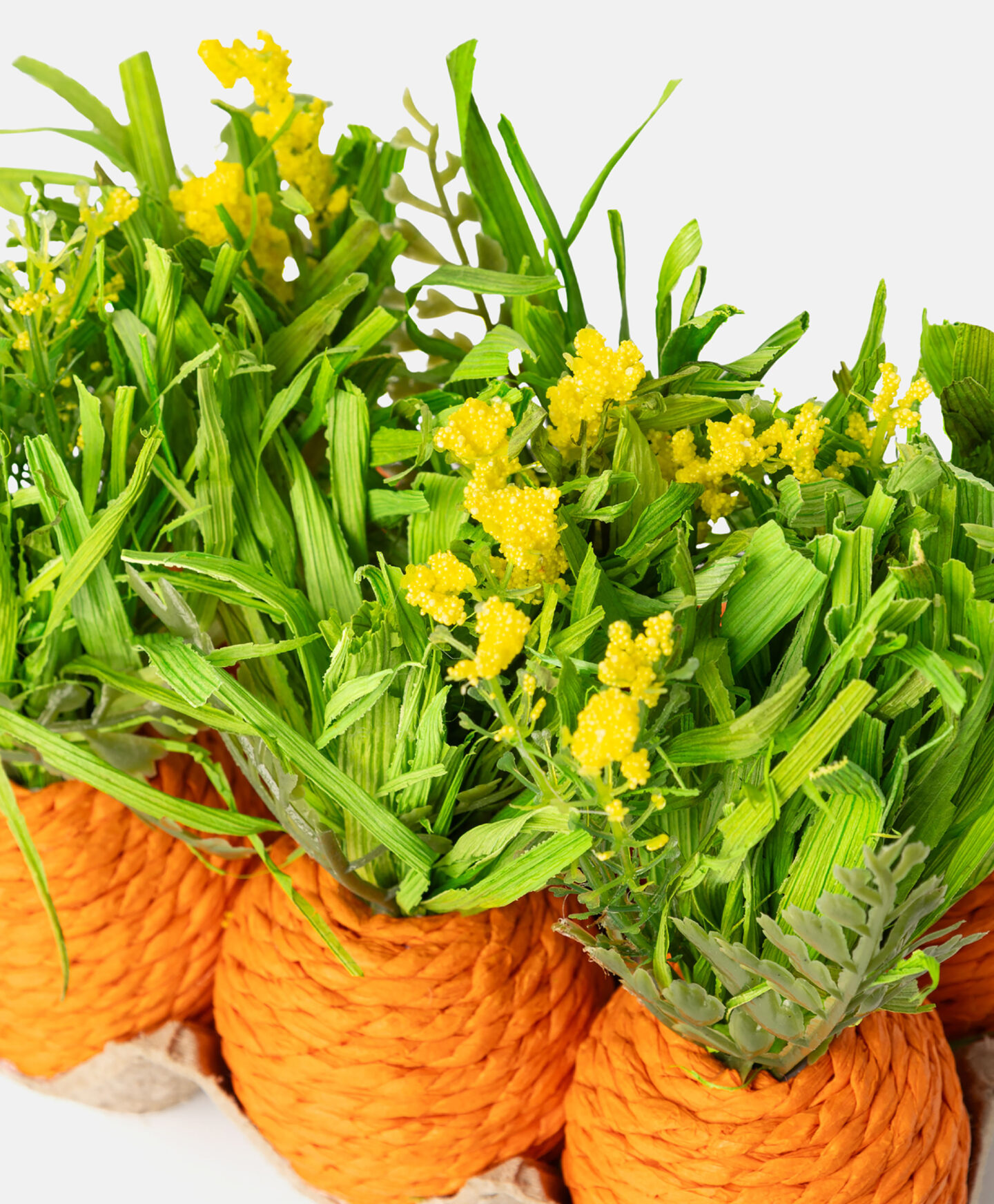 Setul de morcovi în ambalaj embosat cu plantă artificială este o soluție estetică pentru cei care nu au grijă de plantele naturale. Această decorațiune mereu verde va arăta frumos pe masă, comodă sau pe birou și va aduce prospețime și o atmosferă de primăvară în orice încăpere.