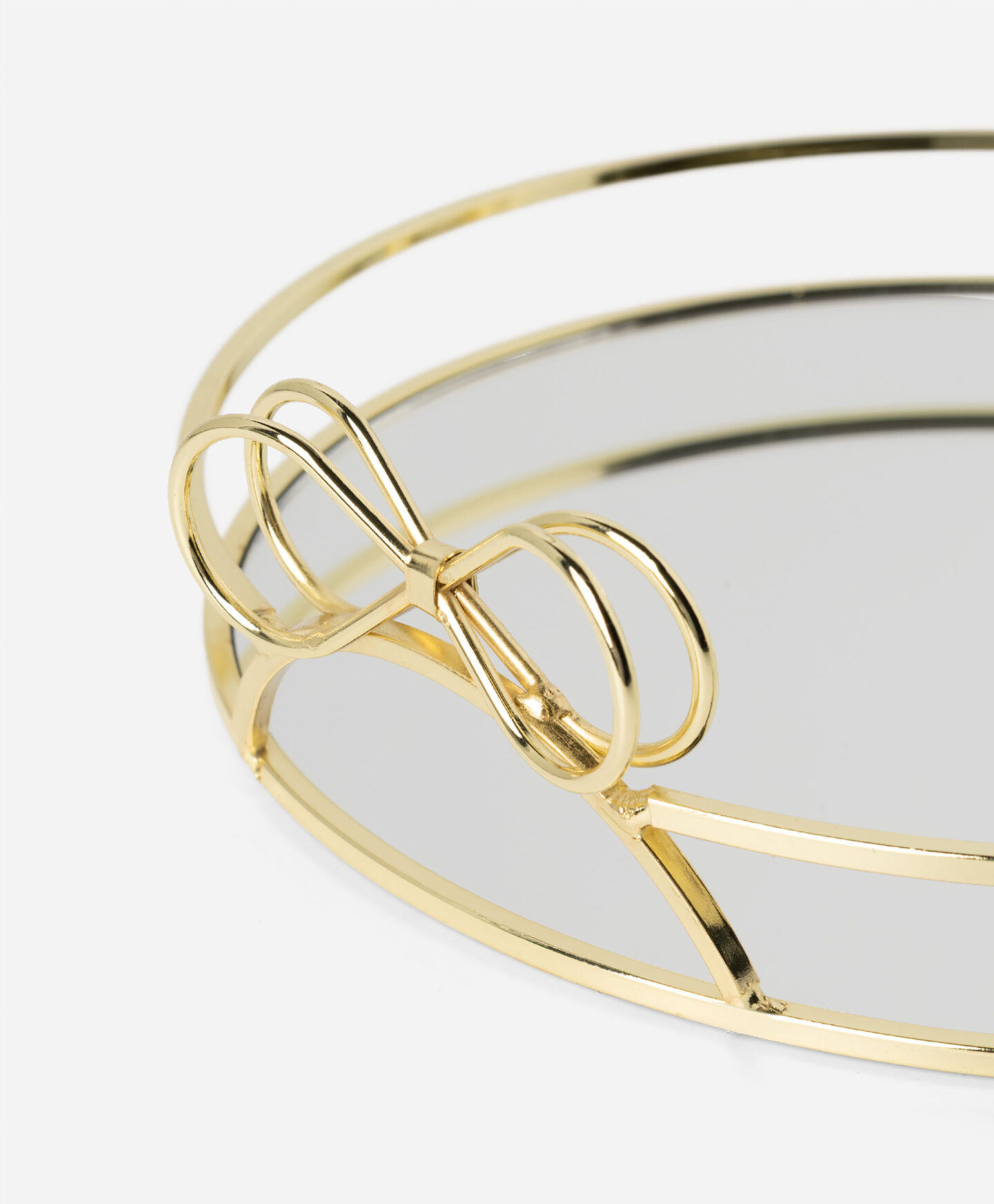 Tava decorativă cu funde pe mânere este un accesoriu stilat care îmbogățește decorul casei tale. Fundul tip oglindă îi oferă un aspect original. Este perfectă pentru servirea cafelei sau ca suport pentru vază ori lumânări.
