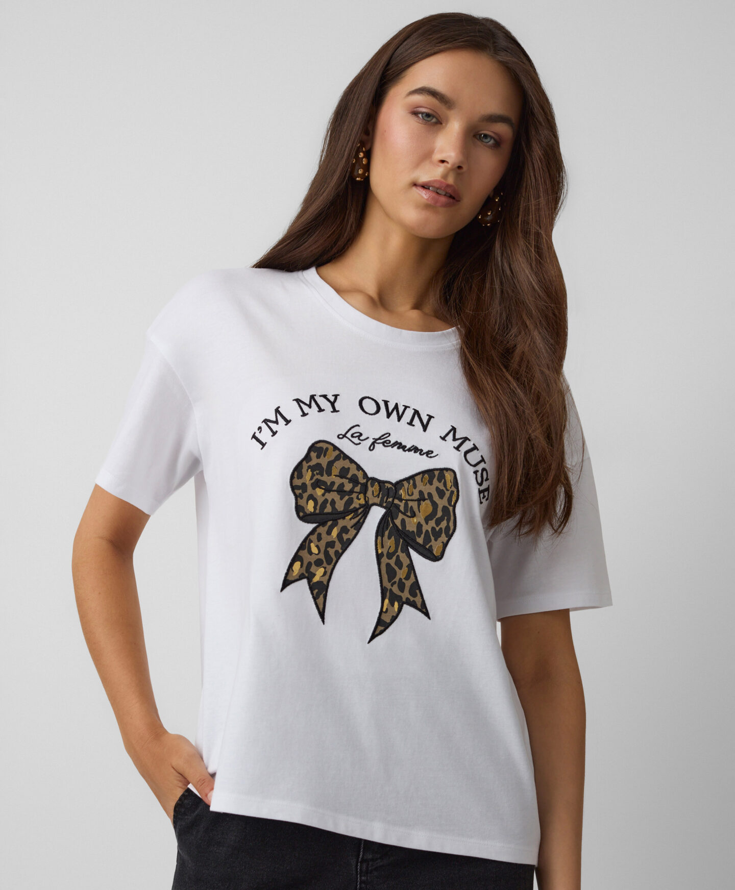 Tricoul pentru femei din 100% bumbac cu fundă este perfect atât pentru purtare zilnică, cât și pentru ocazii speciale. Materialul este prietenos cu pielea și îți garantează confort pe tot parcursul zilei. Funda din față este un detaliu subtil, dar de efect, care adaugă farmec oricărei ținute.