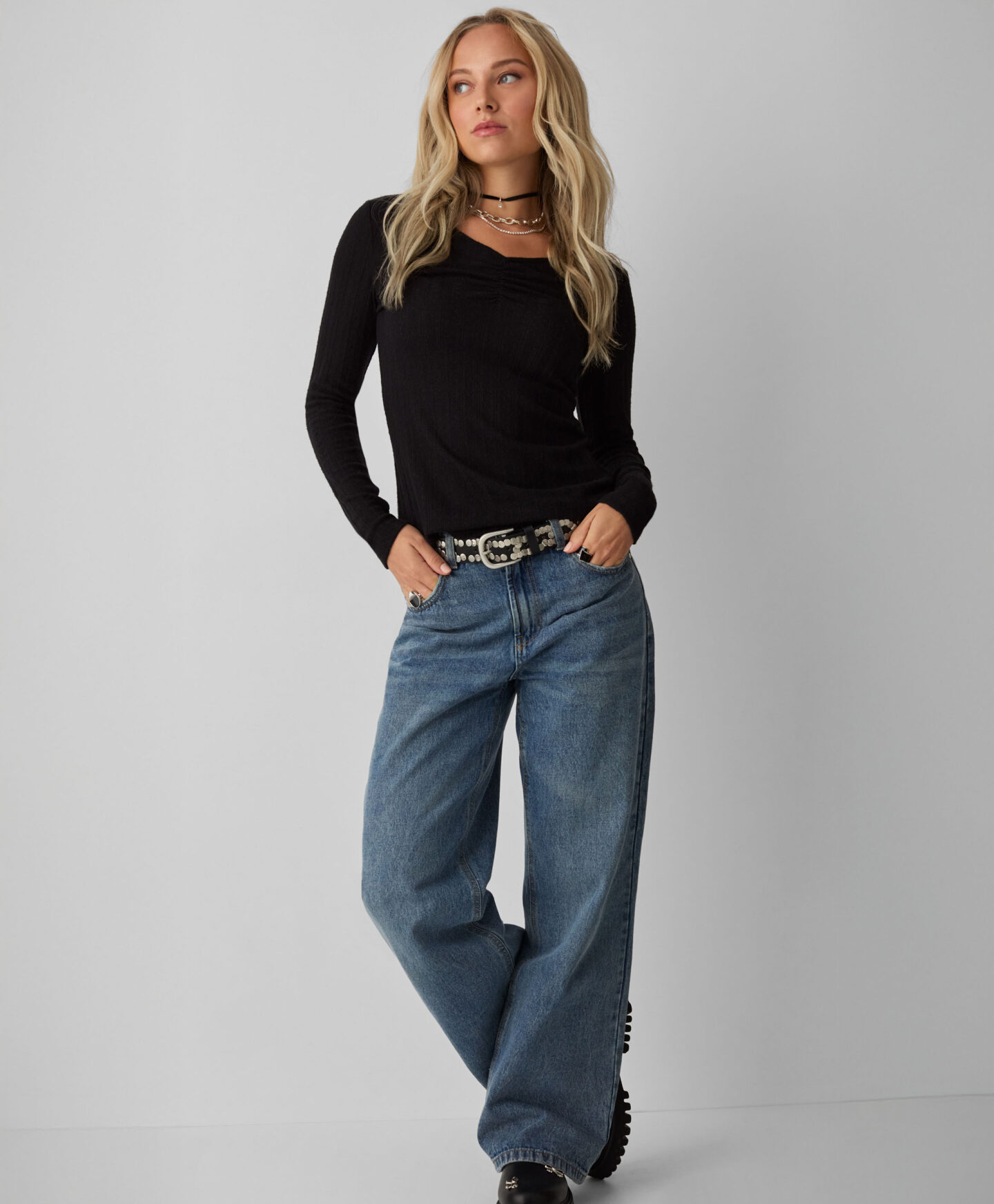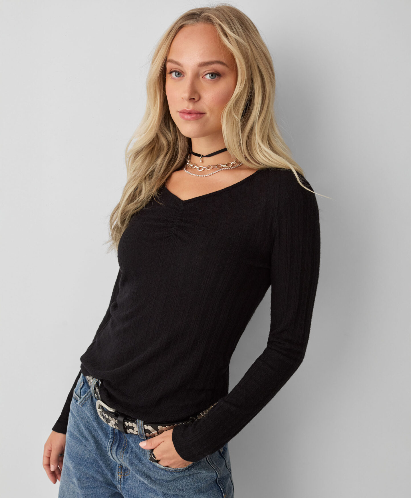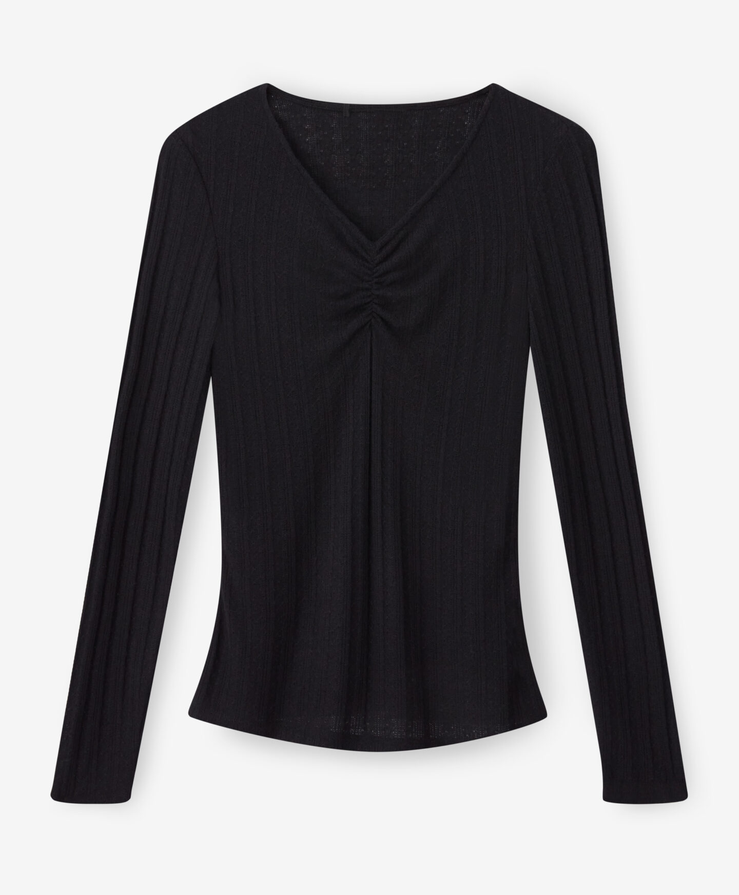 Tricoul pentru femei încrețit cu mâneci lungi este dedicat iubitoarelor de stiluri clasice. Îl poți purta sub un sacou mai larg sau un pulover, oferindu-ți un strat suplimentar de confort. Încrețitura de la decolteu este un detaliu feminin care îți evidențiază silueta. Culoarea neagră îl face ușor de asortat cu orice.