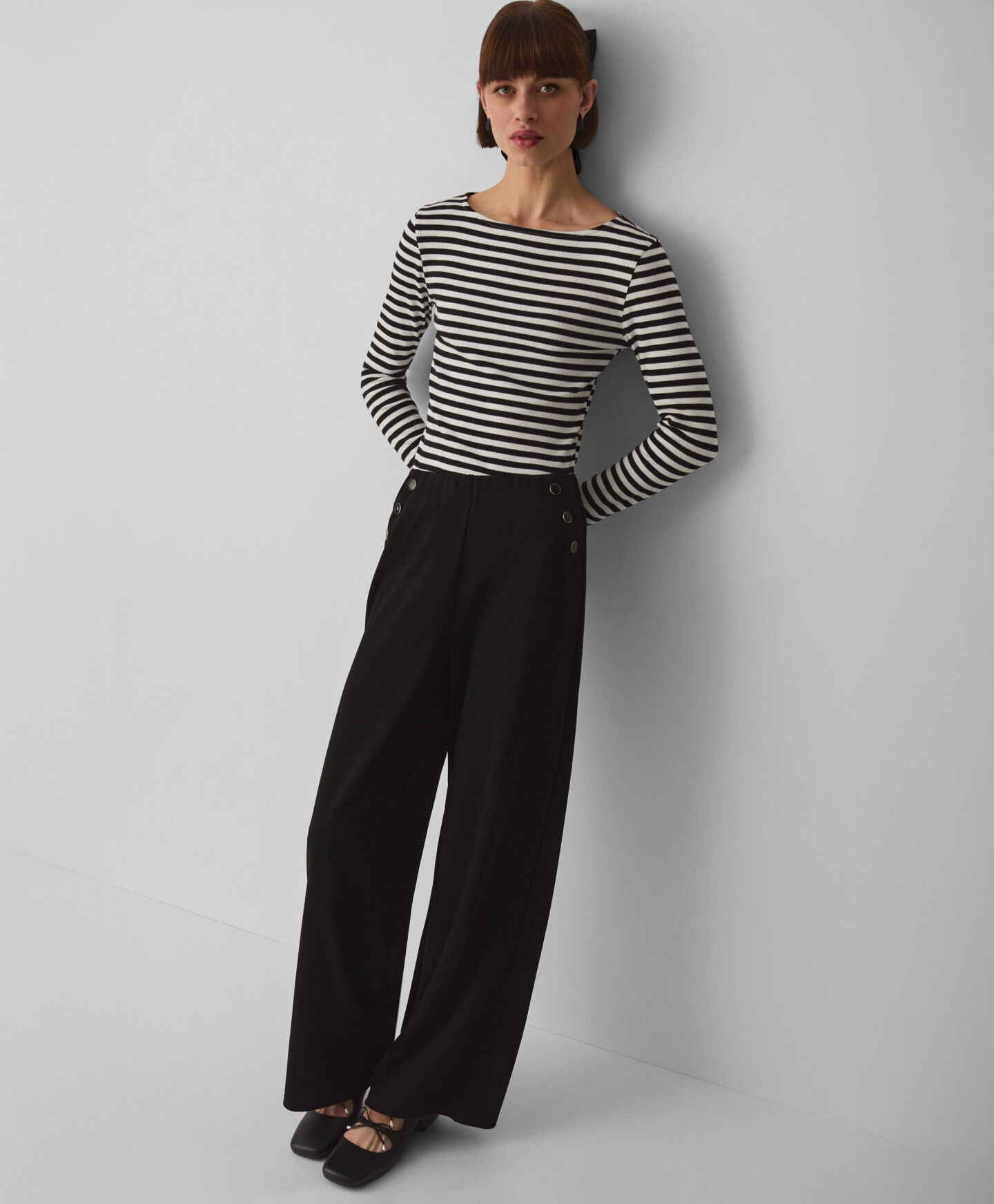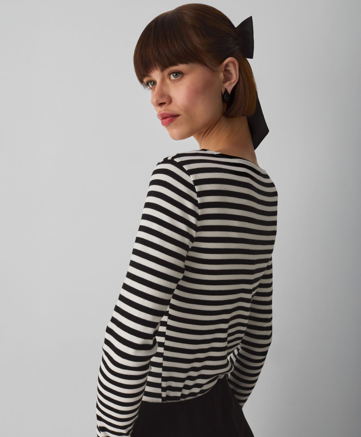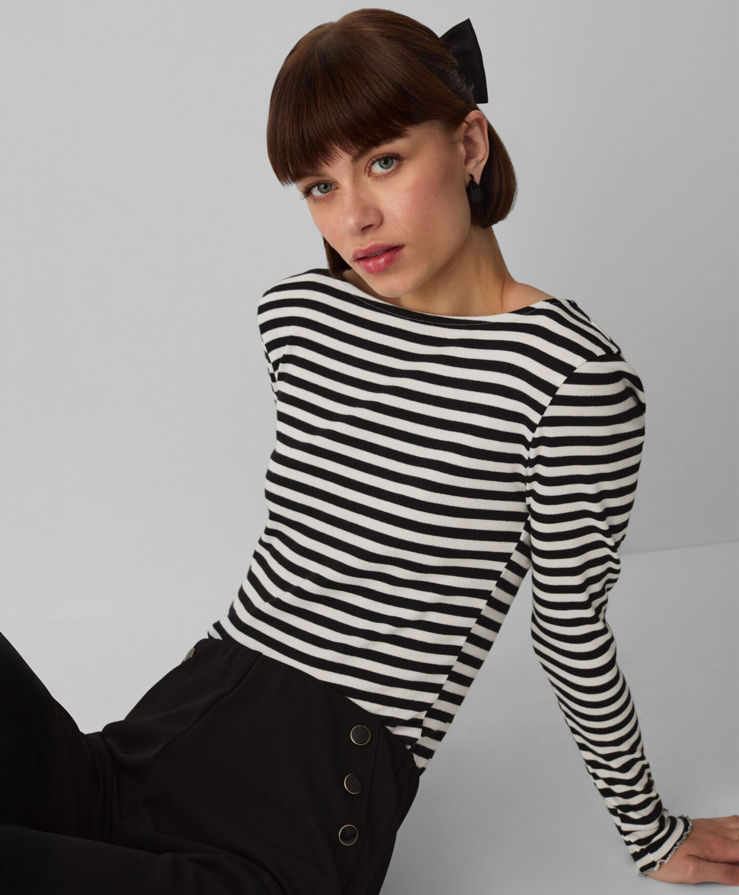 Tricoul pentru femei în dungi, cu conținut ridicat de bumbac, arată excelent purtat cu blugi clasici. Este ușor, moale și respirabil. O alegere excelentă atât pentru serviciu, cât și pentru relaxare acasă. În colecție vei găsi mai multe variante de culori.