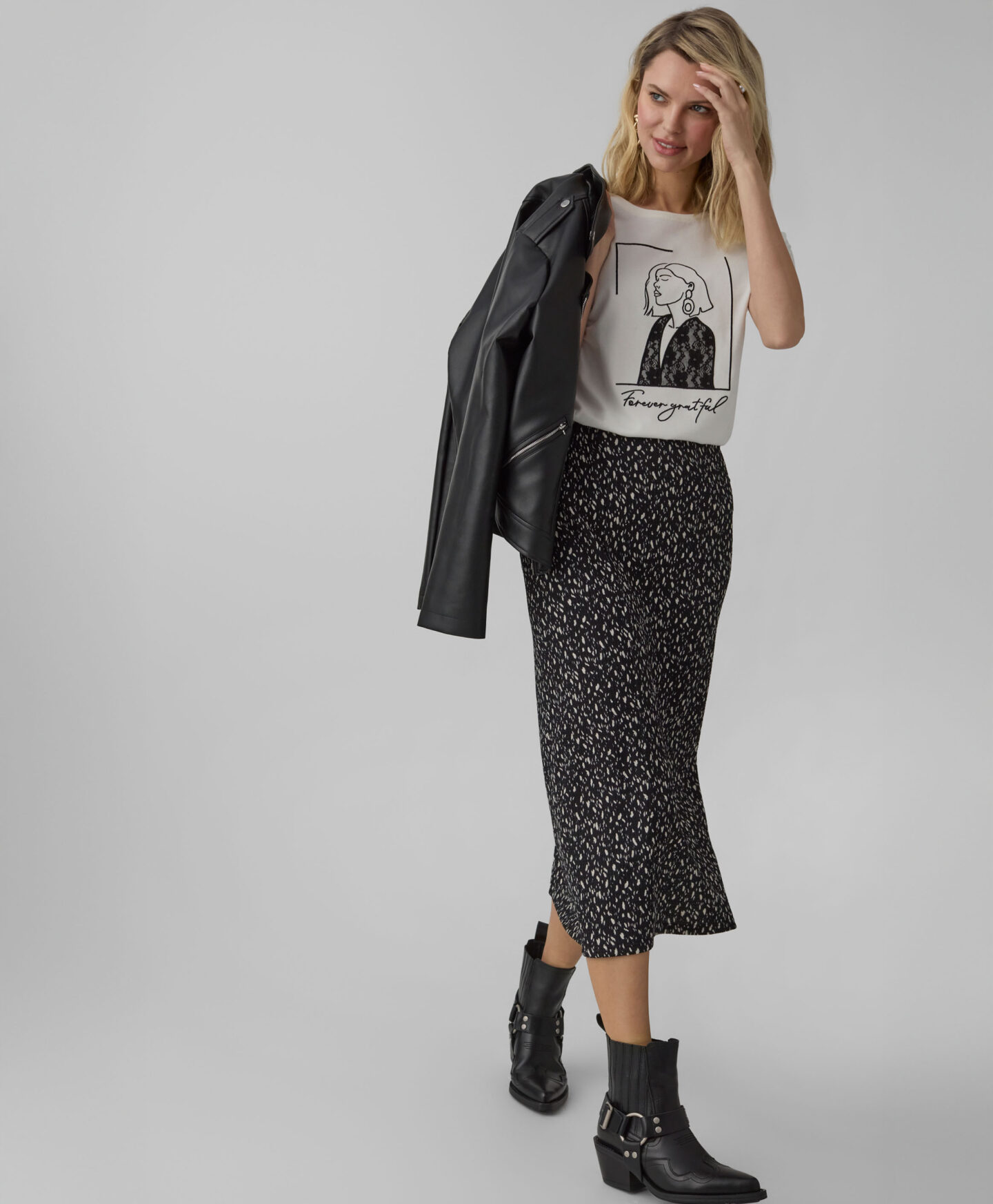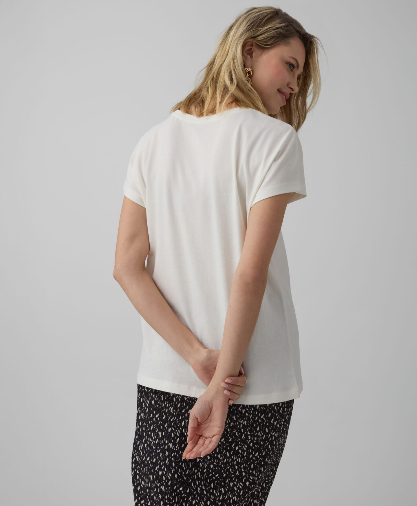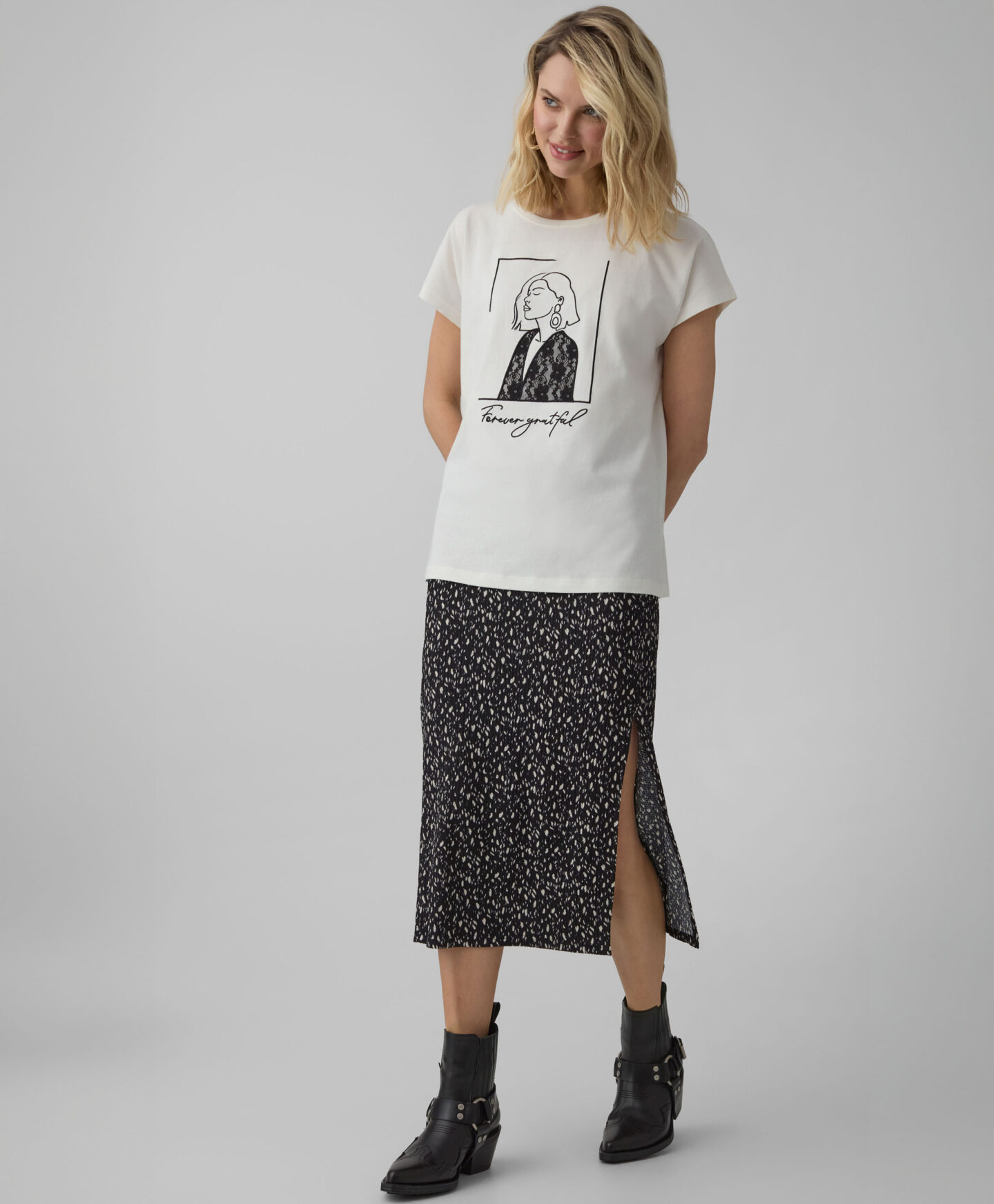 Tricoul pentru femei cu imprimeu frontal îmbină stilul clasic cu detalii moderne. Atrage privirile și completează armonios atât ținutele casual, cât și pe cele mai elegante. Materialul plăcut la atingere oferă confort pe tot parcursul zilei.