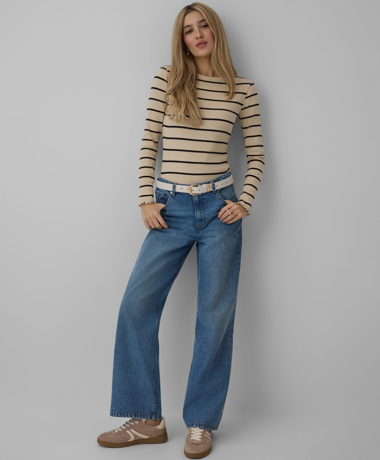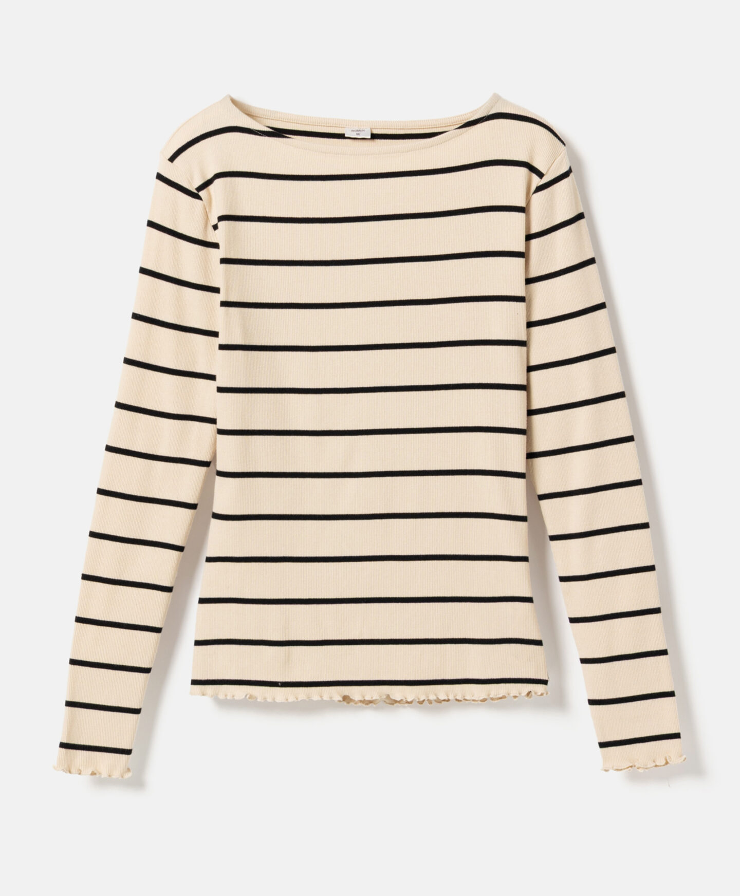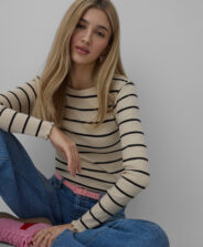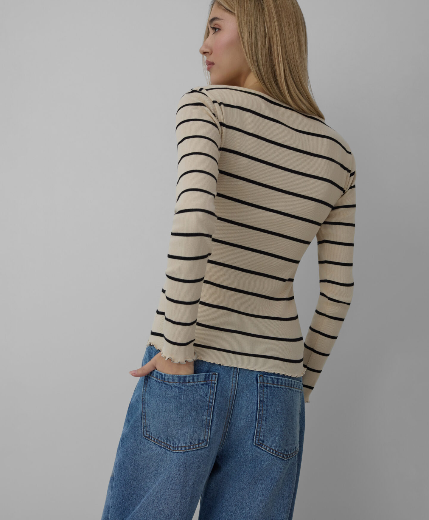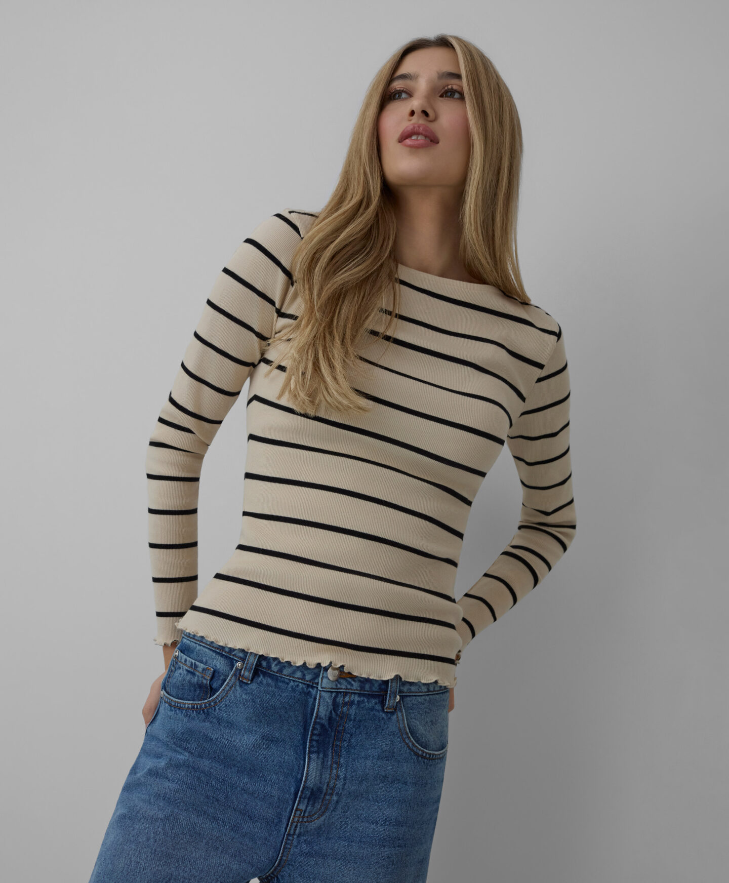 Tricoul bej în dungi pentru femei se așază perfect pe siluetă. Detaliile decorative adaugă un accent stilat, iar tricoul se potrivește atât cu blugi, cât și cu pantaloni eleganți. Este disponibil în două variante de culoare.