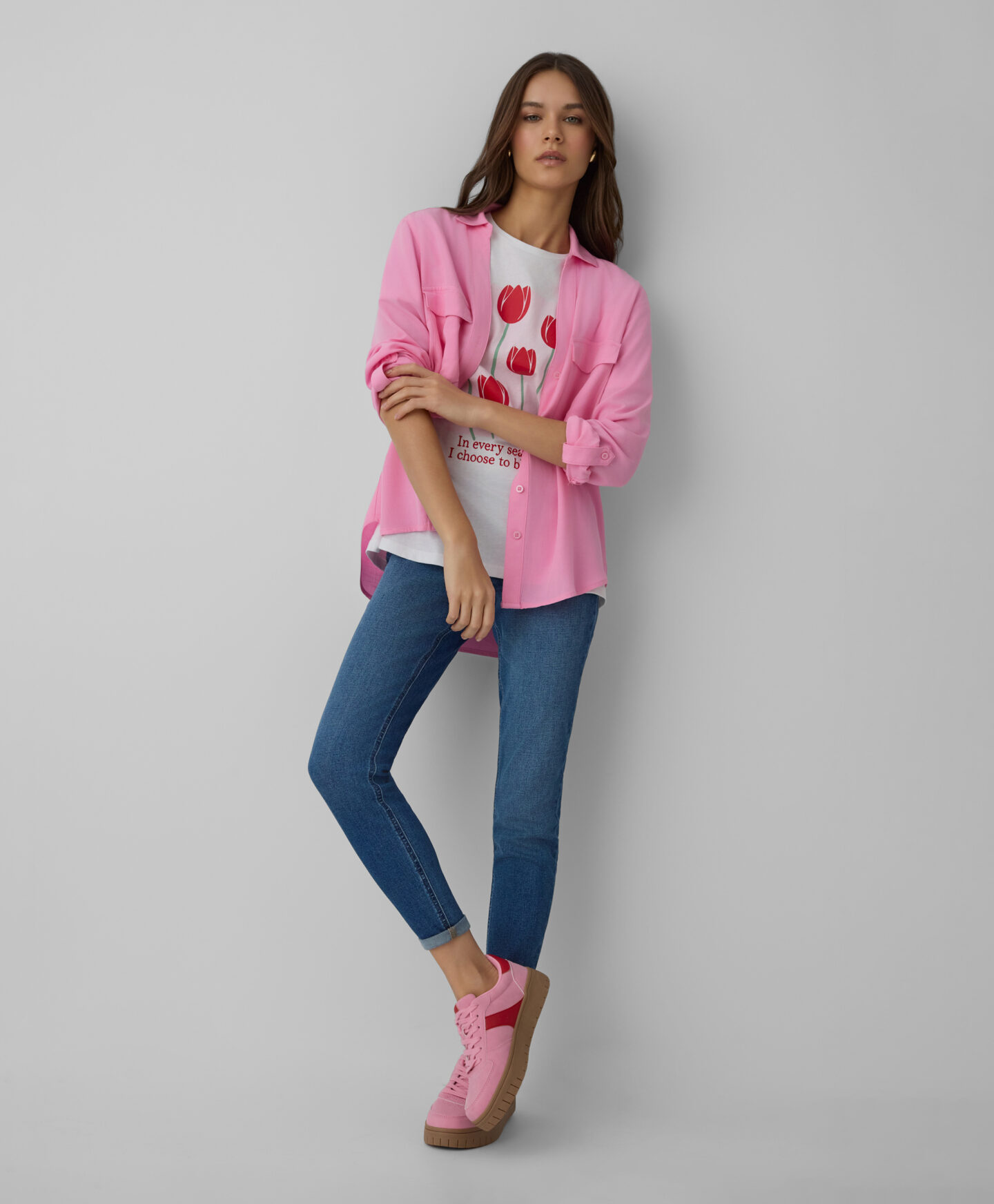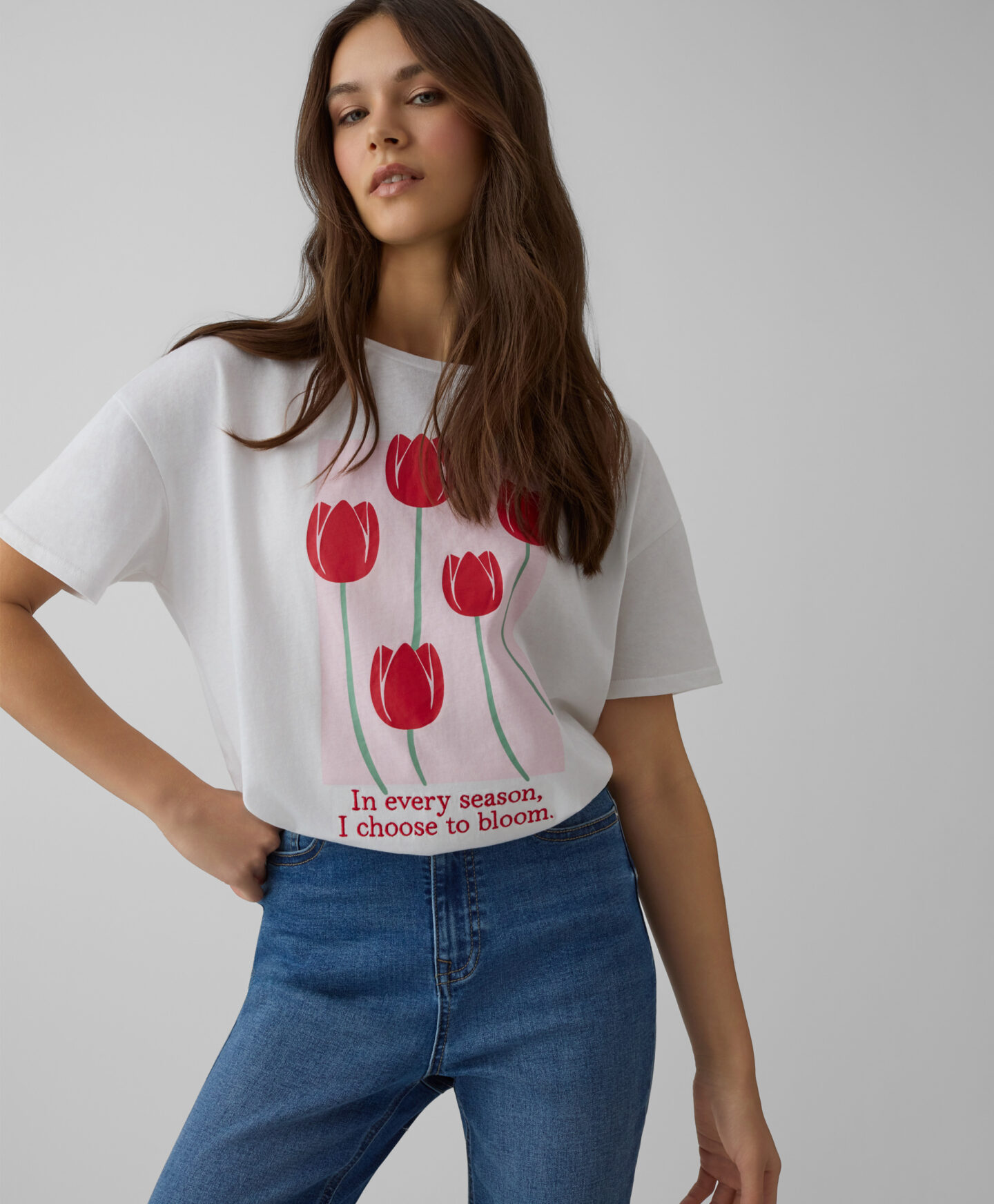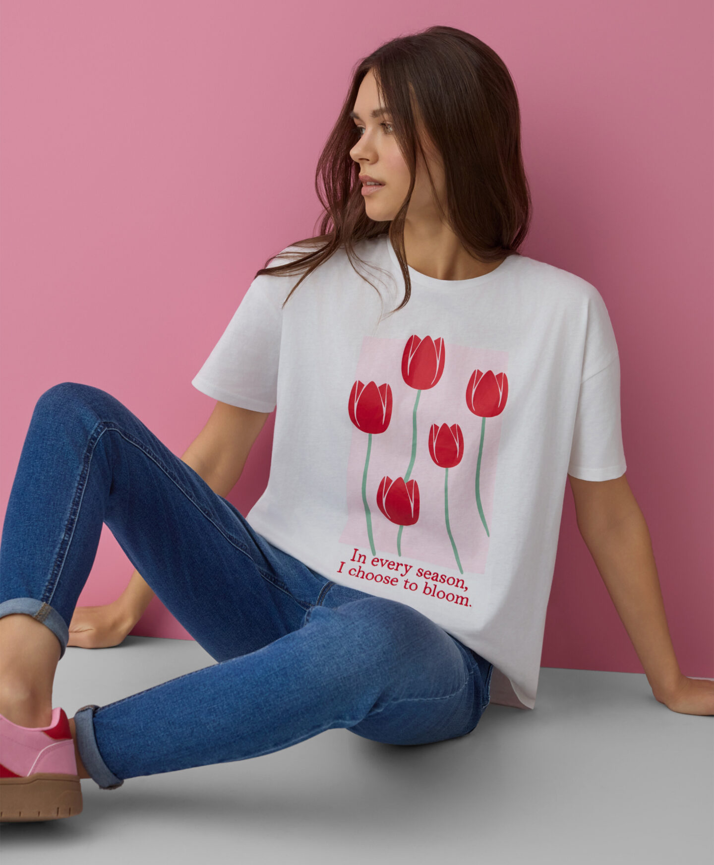 Tricoul pentru femei cu imprimeu floral, cu mânecă scurtă, este ideal pentru ținutele de zi cu zi. Materialul respirabil oferă confort, iar imprimeul floral din față adaugă prospețime și un aer feminin.